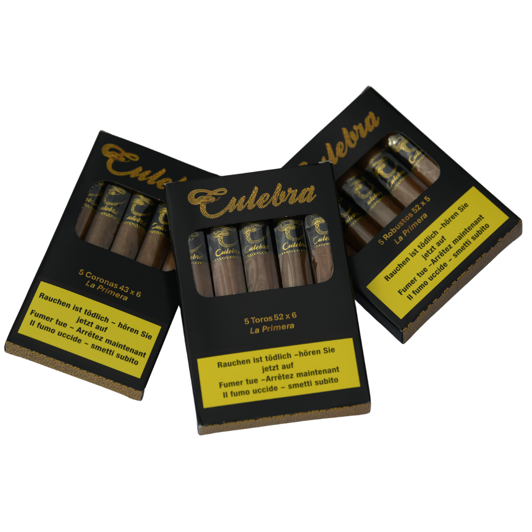 La Colección Culebra brings together the full La Primera range in one curated set. It includes 15 handmade Dominican cigars: 5 Robustos, 5 Toros and 5 Coronas, each presented in their own cardboard box.